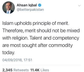 Former interior minister Ahsan Iqbal (PML-N) said in a tweet that only “talent and competency” should matter and “merit should not be mixed with religion”.
