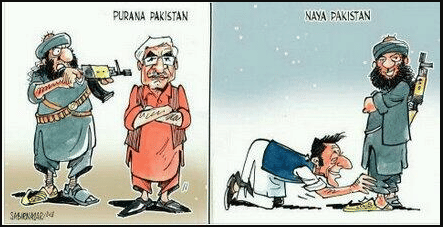 Imran promises a new or ‘Naya Pakistan’. In this old cartoon, Pakistan’s best known cartoonist Sabir Nazar shows the difference between old Pakistan and the promised new Pakistan. As militants participate in elections this time, the old cartoon is being circulated again.