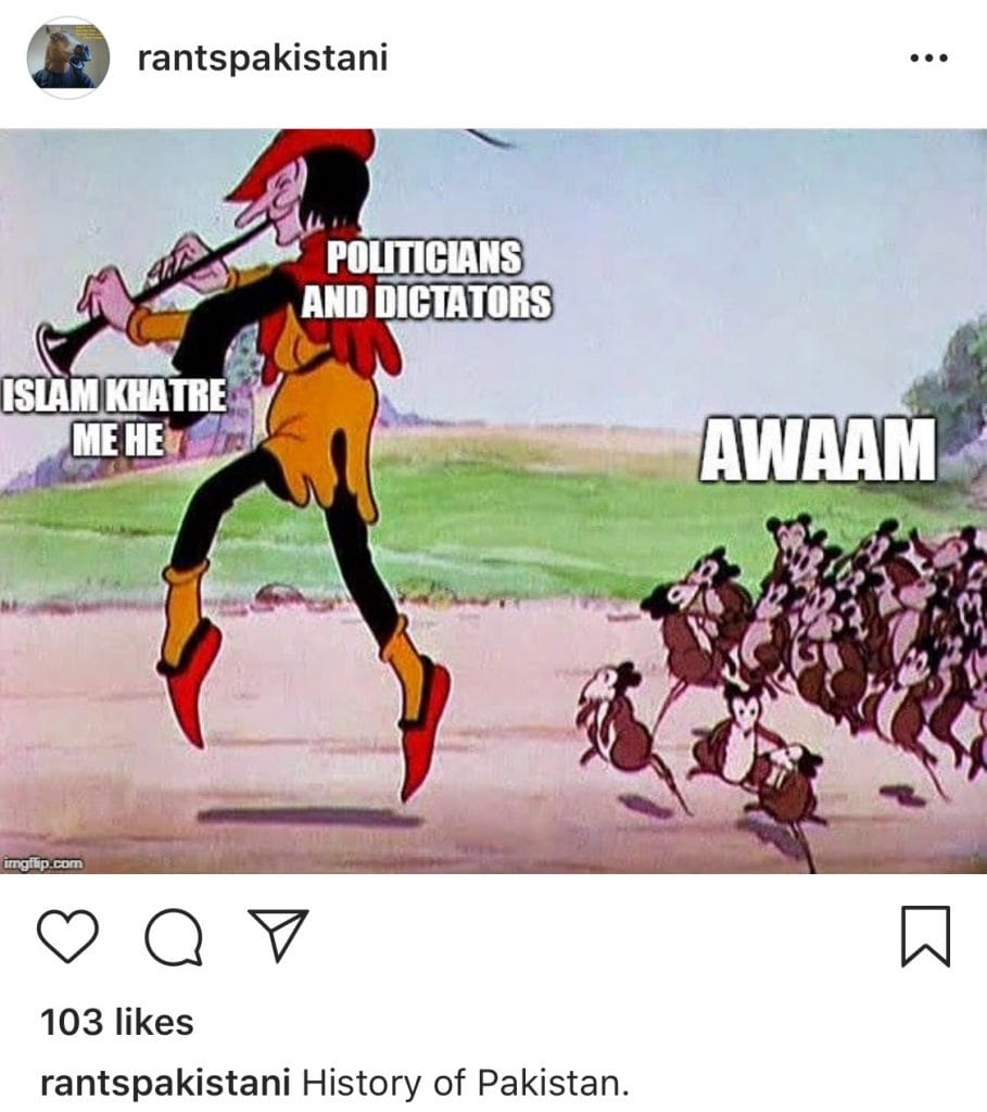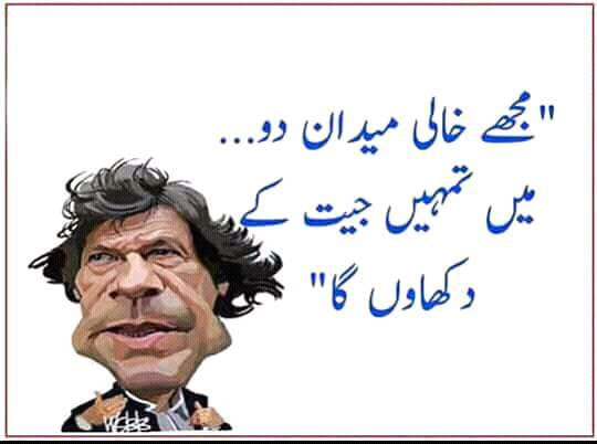 As this meme has Imran Khan saying, “Mujhay khali maidan do, main tumhay jeet ke dikhaonga. (Give me an empty field and I’ll show you how I win).” The suggestion is that Imran Khan will win only because the field has been vacated for him – others are practically not being allowed to play.