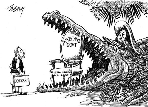 The cartoon below shows democracy in Pakistan about to be devoured by the army, which has the seat of government in its jaws.