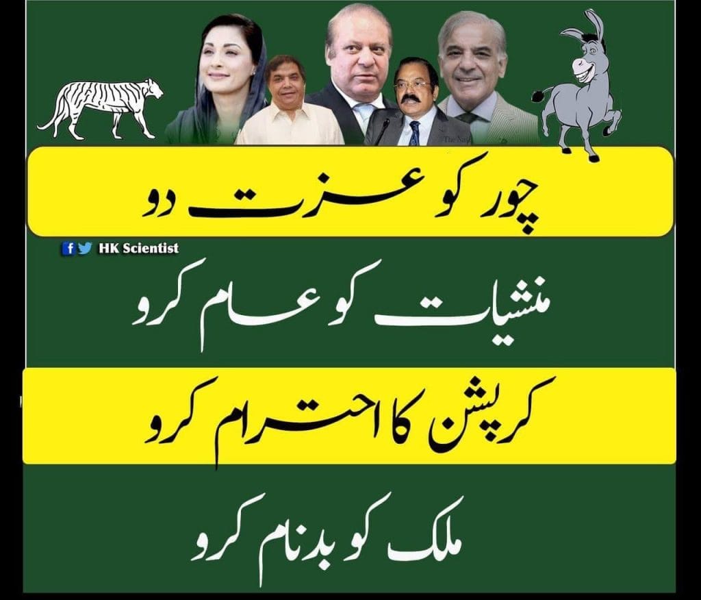 This anti-PML(N) poster says in Urdu, “Chor ko izzat do/ Manshiat ko aam kero/ corruption ka ehtram kero / mulk ko badnam kero (Give honour to the thief, make drugs commonplace, respect corruption and defame the country).” The first point is a pun on the PML(N)’s slogan this election, “Vote do, izzat lo” – asking people to vote for the PML(N) as a matter of honour given the biased judicial action against Nawaz and his family.