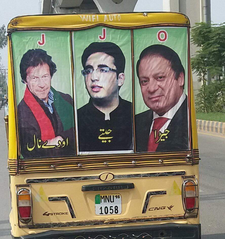 Many “electables” have joined the PTI – that’s a term for politicians who drift towards the party considered likely to make them win. The Punjabi behind this autorickshaw says, “Jeda jeetay, odhey naal (I’m with whoever wins).” That’s the spirit of the electables too.