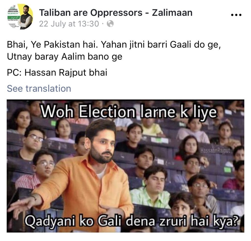 One religious politician, Khadim Hussain Rizvi, has uttered the words pehn di siri during protests. It’s a reference to the sister abuse. Siri is the goat’s head and pehn is sister. As a religious party refuses to publicise the woman candidate’s face, thanks to religious conservatism, someone jokes, Pehn di no siri.