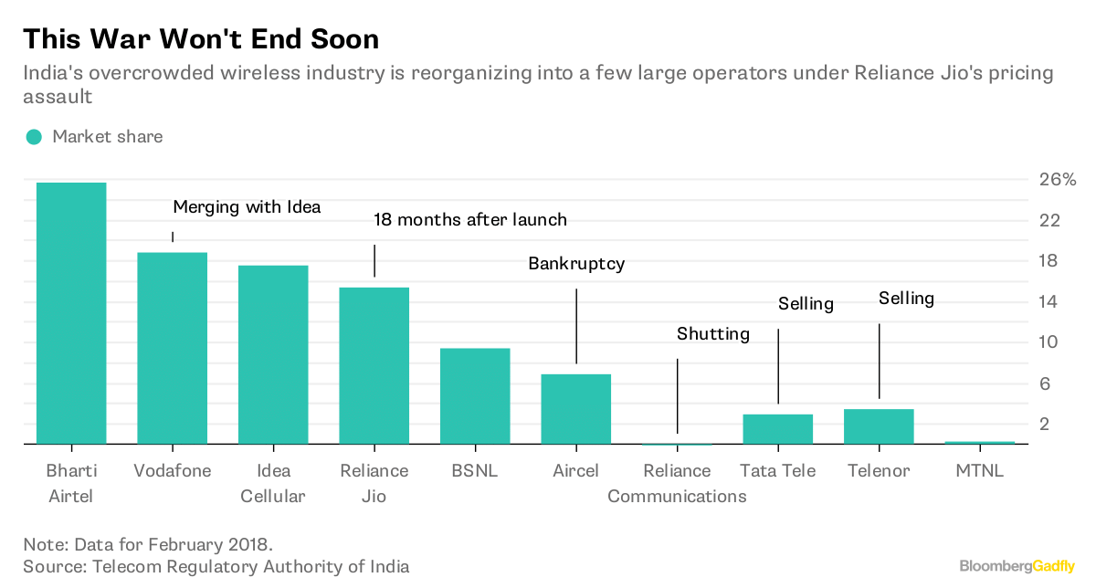 It’s hard to say what the 2020 landscape may look like. Assuming Jio and Bharti are close rivals that each have a substantial revenue market share, the prognosis must be bleak for Vodafone and billionaire Kumar Mangalam Birla.