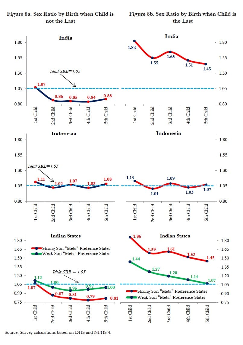 For India, the sex ratio of the last child for first-borns is 1.82, heavily skewed in favor of boys compared with the ideal sex ratio of 1.05. This ratio drops to 1.55 for the second child for families that have exactly two children and so on. The striking contrast between the two panels conveys a sense of son meta preference. This contrast is even more stark when seen against the performance of Indonesia (middle panels) where the SRLC is close to the ideal, regardless of the birth order and whether the child is the last or not.