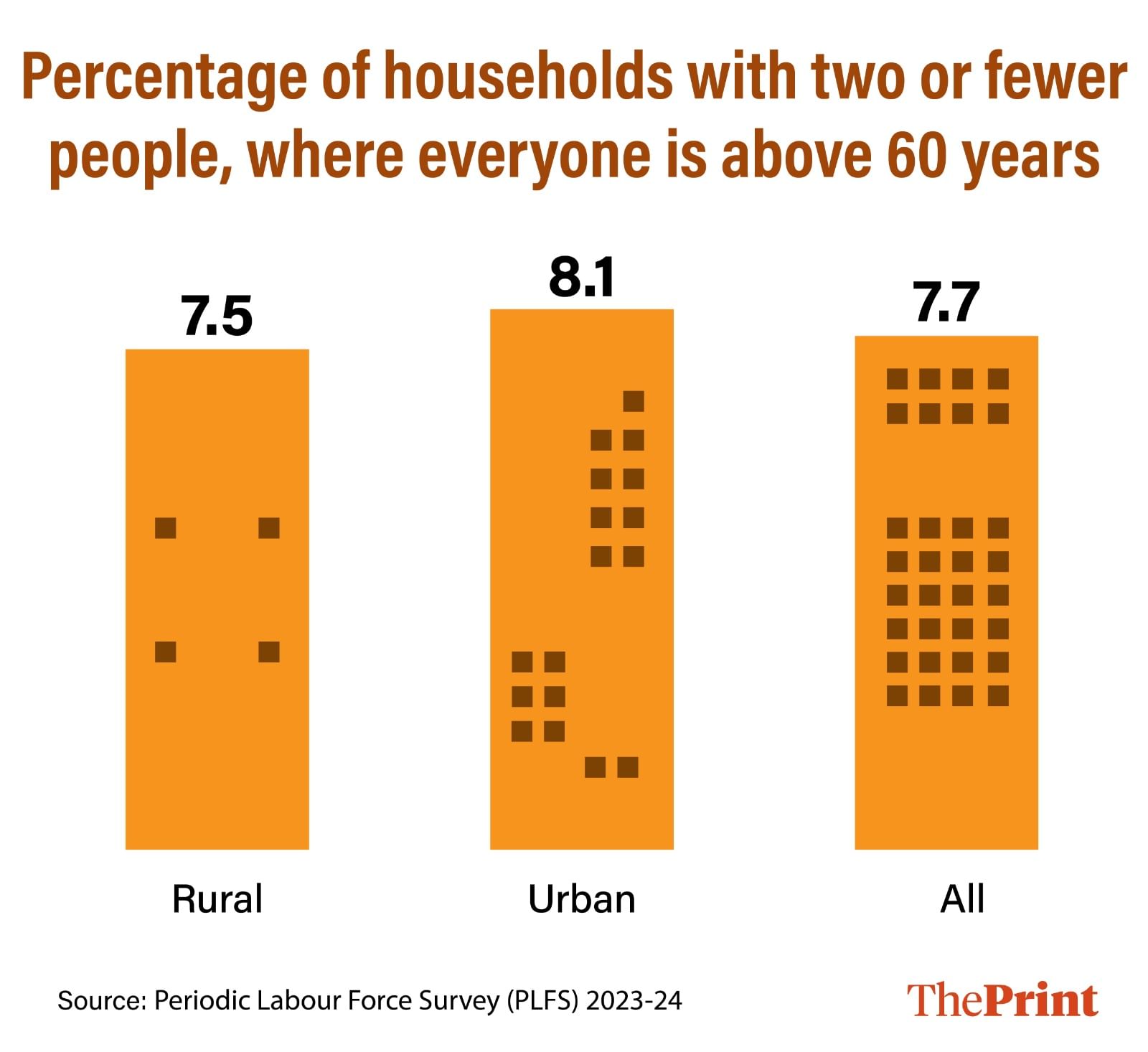 As per Periodic Labour force Survey (PLFS) 2023-24, across the country, 7.7 percent of households consist solely of elderly members aged above 60 years, with a maximum household size of two. The share is slightly higher in urban India (8.1 per cent) compared to rural India (7.5 per cent), reflecting changing family structures and the gradual erosion of traditional support systems.