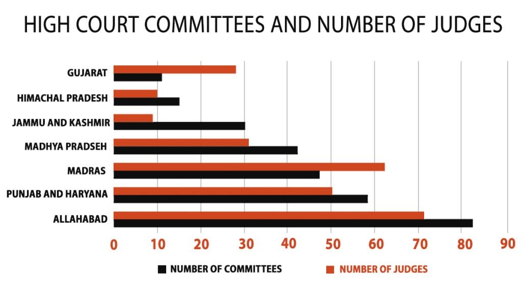 This trend was worse in the Allahabad High Court. Three judges were a part of more than 20 committees each – one judge was in 28 committees, one in 26 committees, and another in 22 committees. Add to this, some judges were given no committee at all.