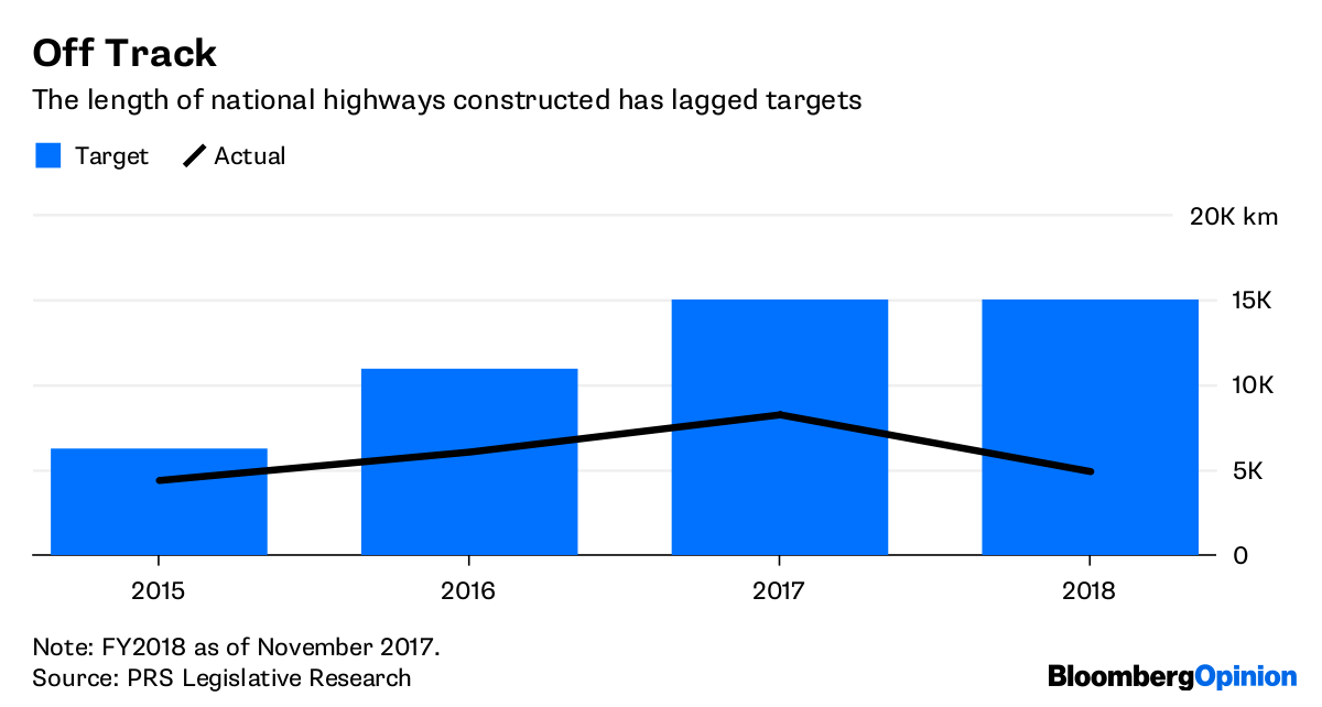 Part of the problem has been the sheer cost and speed of execution. Modi’s government is building around 22 kilometers of roads a day. That’s more than its predecessors but still only half of its own target. The pace of construction has fed concerns that India will repeat the experience of previous infrastructure binges, where loans were doled out liberally to builders, leading to hard-up borrowers, a banking system plagued with bad assets, and unfinished roads.