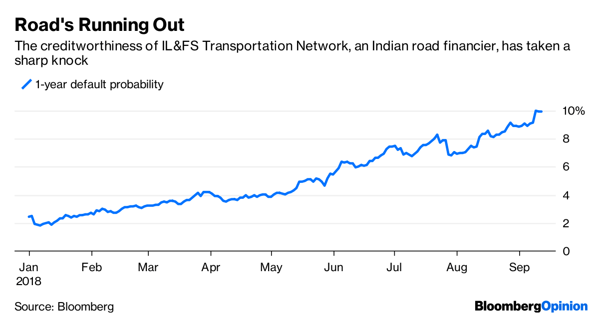 Not only do India’s state-run banks have bulky exposure to IL&FS, they have also lent to some of the same projects that put it in trouble. Nomura reckons that IL&FS Transport Network’s road assets are being carried as standard on the balance sheets of many banks. That’s laughable, given that IL&FS Transport’s own one-year default probability is approaching 10 percent, according to a proprietary Bloomberg model. Asking banks to reclassify these advances as nonperforming and make provisions at a time when they have no profits and $200 billion in stressed assets would be a stab to the heart of India’s financial system.