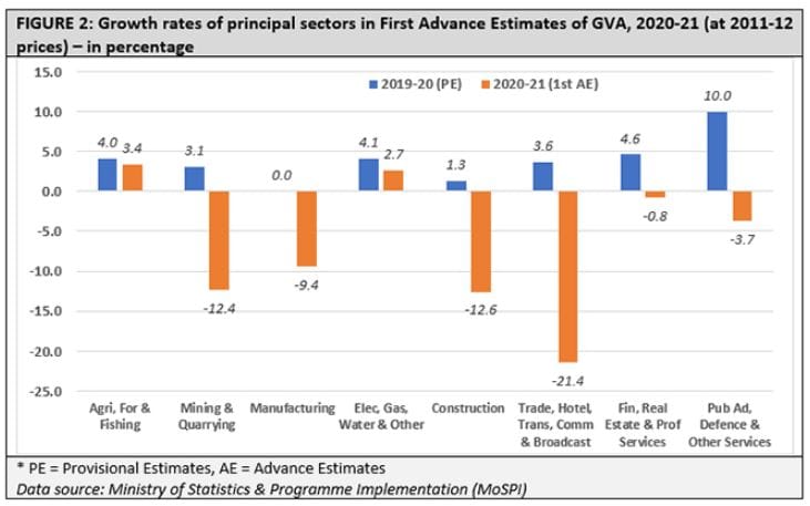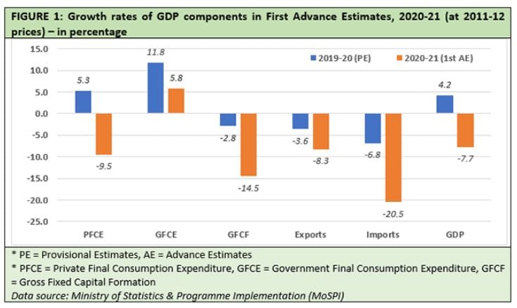 First Advance Estimates project the value of real GDP (gross domestic product) at constant prices (base: 2011-12) for the year 2020-21 at Rs. 134.40 lakh crore – compared to Provisional Estimate of 2019-20 GDP at Rs. 145.66 lakh crore. So, the real GDP growth rate is projected to be -7.7%, as against 4.2% real GDP growth in 2019-20.