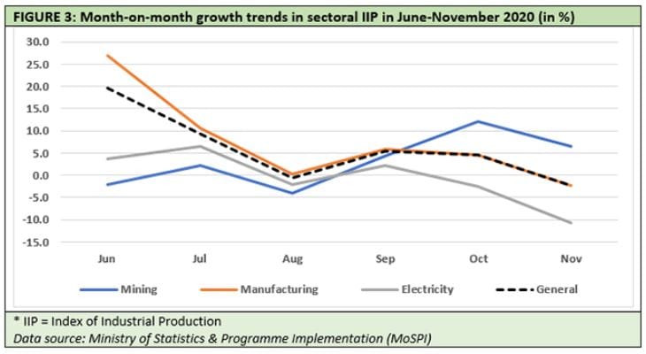 The pandemic induced restrictions were lifted in June 2020. If month-on-month growth rates in IIP figures are calculated since June, then the trendlines have fallen till August, then somewhat went up in next two months, but have fallen again in November – when the festive season was over (Figure 3).