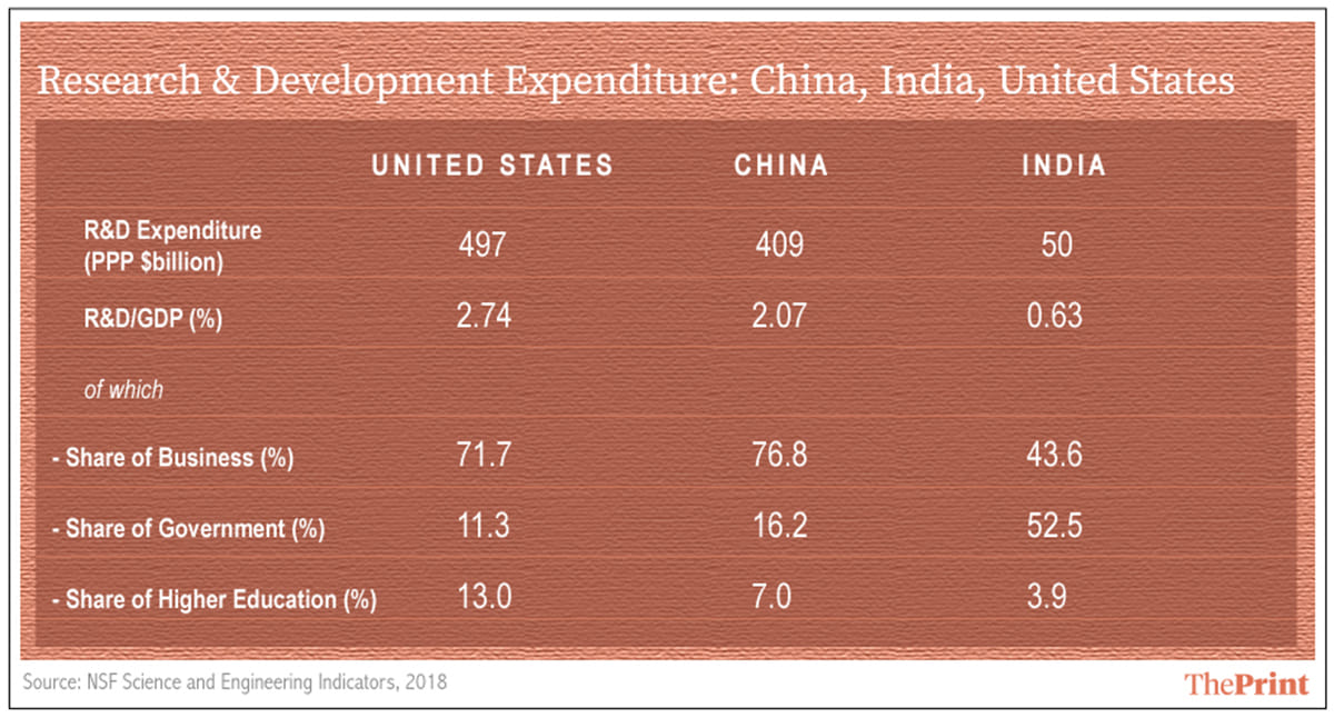 Among large countries, India is an outlier — its aggregate expenditures on research and development (R&D) are modest, both in absolute numbers as well as the low share of R&D in GDP. Furthermore, within this expenditure, public spending looms much larger than in other countries and the role of higher education is de minimis. (Table 1).