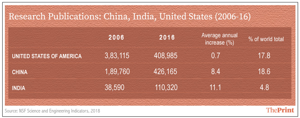 This increase needs three qualifications. First, quantity is not quality. Much of this is mediocre and India’s share in ‘high impact’ or ‘most cited’ publications considerably lags the overall increase in publications output.