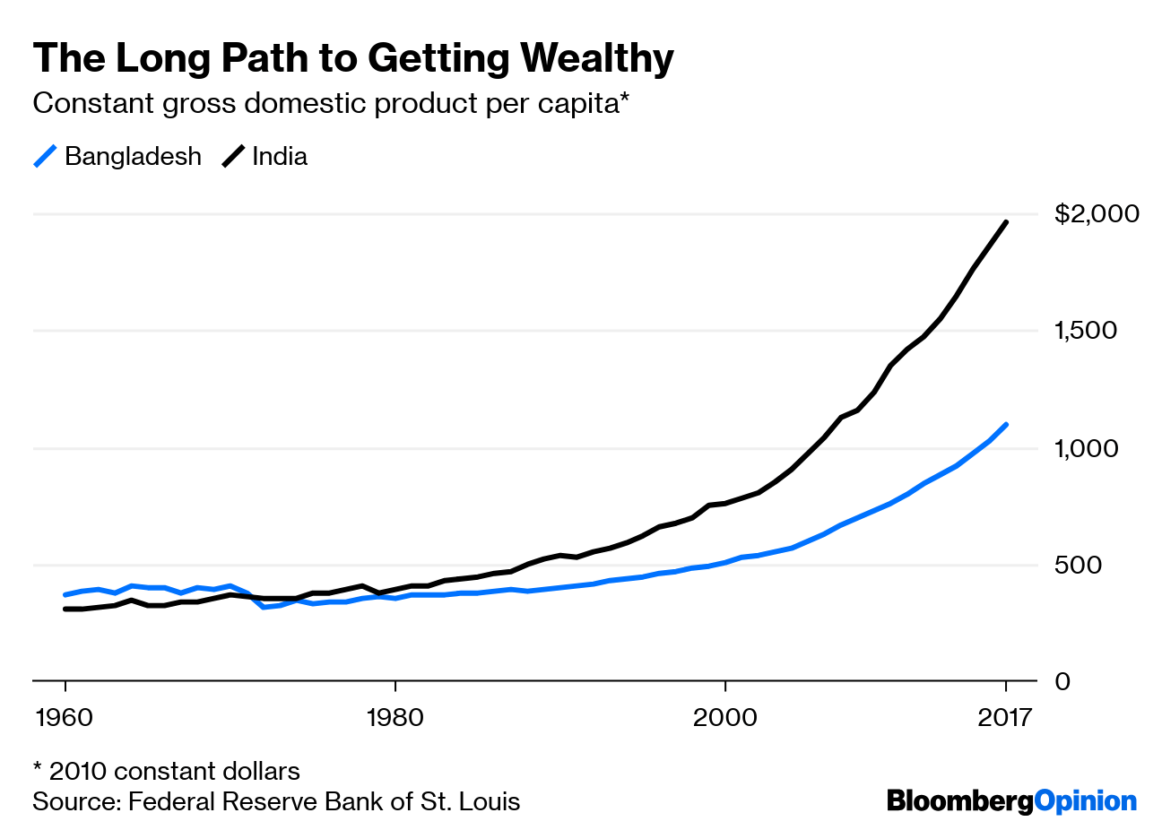 This economic development path has no doubt come at a real human and social cost — Bangladesh’s workers suffer harsh working conditions and many industrial accidents, including a horrific factory collapse in 2013 that killed more than a thousand people. But overall, the tried-and-true industrialization strategy seems to be working. Real GDP per capita has doubled since the turn of the century, and Bangladesh appears to be on a similar exponential growth path as its neighbor India:
