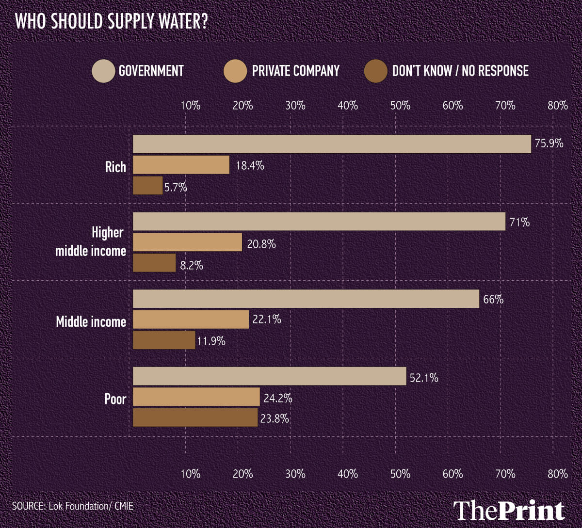 Despite this state of affairs, Indians still very much want the government to provide them with drinking water. Over half of all people – and more so among the rich – wanted the government instead of a private company to provide them with piped water, according to the large sample nationally representative Lok Foundation survey administered by the Centre for Monitoring Indian Economy (CMIE).
