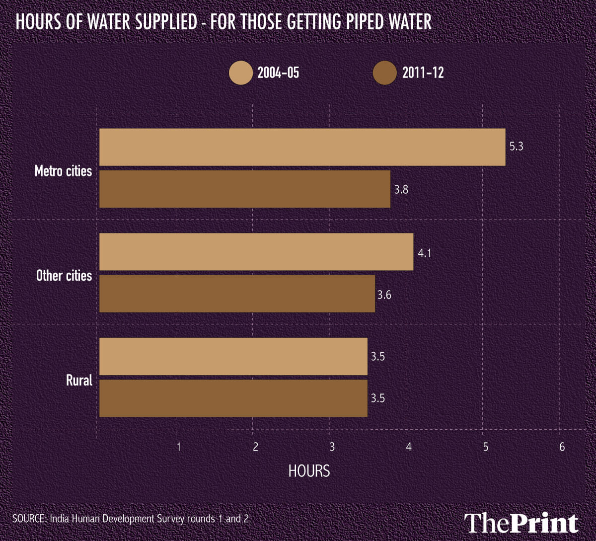 Just 44 per cent of households have access to piped water, and piped water access has increased by barely four percentage points between 2004-05 and 2011-12, according to household survey data from the India Human Development Survey. The duration of water availability actually declined between two rounds of the survey. Women and girls spend about 52 minutes per day just collecting water (men and boys spend 28 minutes).