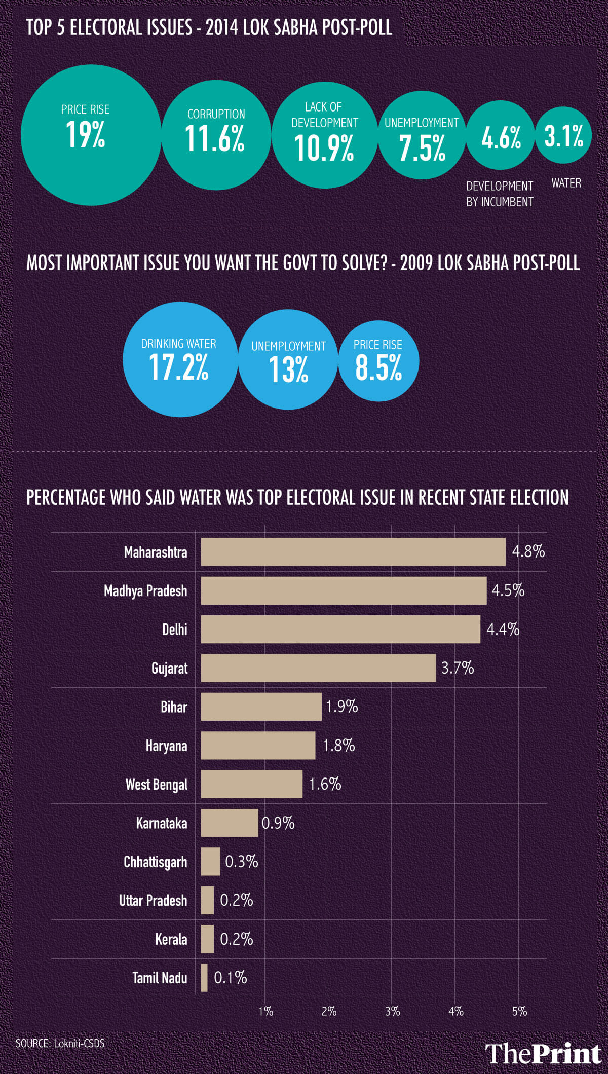 The most widely used dataset on Indian voter behaviour comes from post-election household surveys conducted by the Lokniti programme at the Centre for the Study of Developing Societies (CSDS). “Water” was the top issue for voters in the 2009 Lok Sabha election, but didn’t make it to the top five in 2014 (data for 2019 is not yet available).