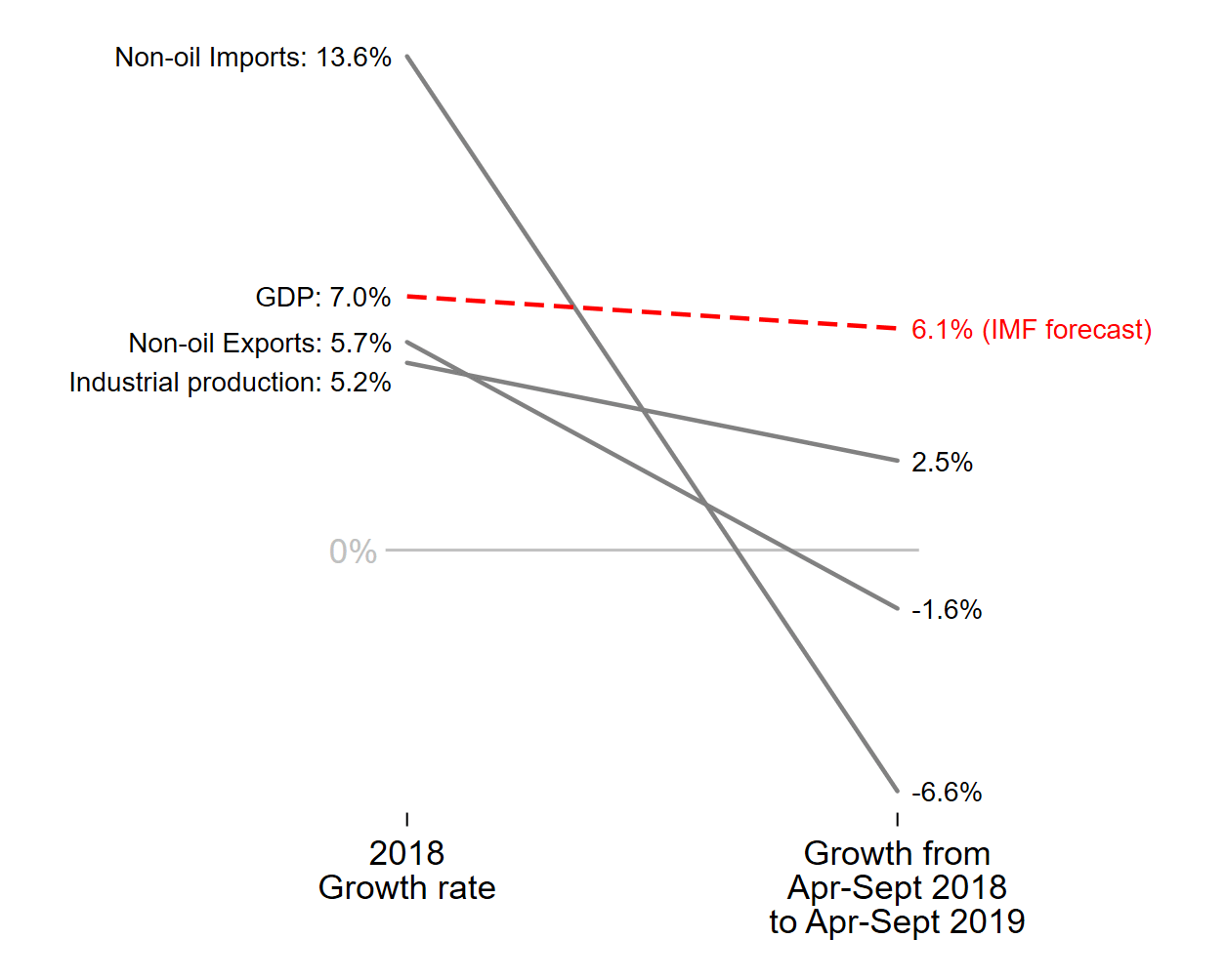Several key indicators are not just slowing, but in absolute decline, including non-oil imports (-6.6 per cent in current dollars), non-oil exports (-1.6 per cent in current dollars), and the index of production of capital and infrastructure goods (-3.5 per cent up to August 2019).