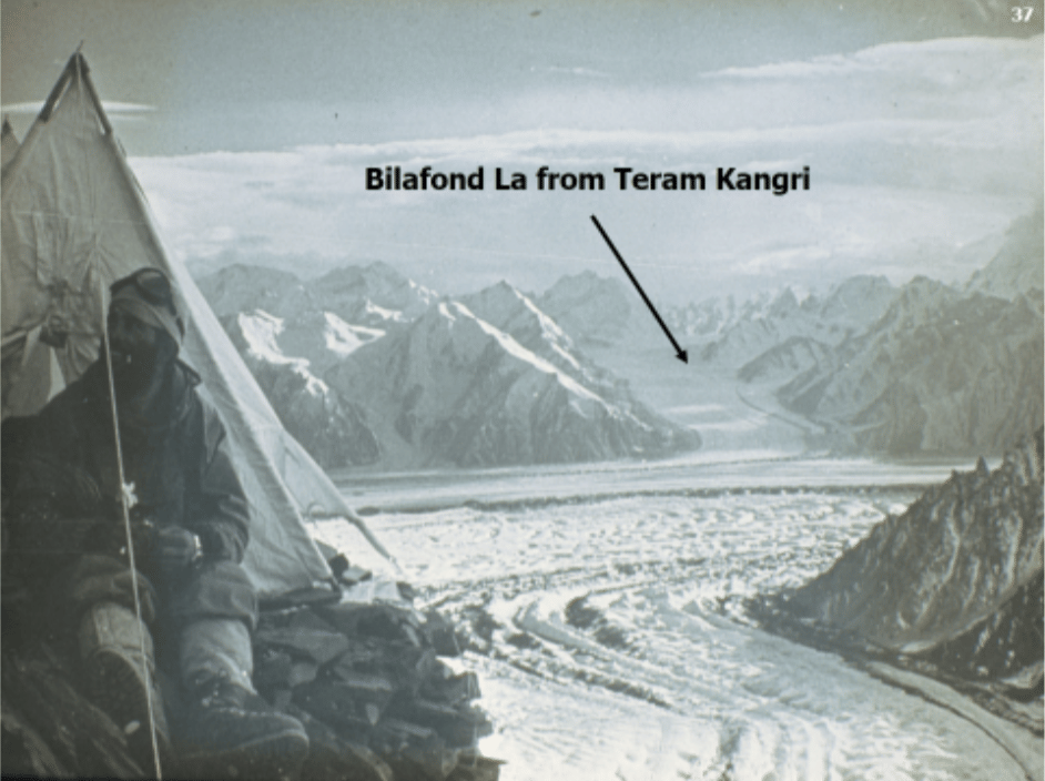 In 1979, three important expeditions crossed the Saltoro ridge and ventured east from the Pakistani side. These were (a) Japanese Expedition to Teram Kangri III led by S Hanada which came in from the Bilafond La in June, crossed the Siachen with 150 porters and established camp on the Teram Shehr glacier before finally climbing out on 29 July 1979, (b) Japanese Expedition to Sia Kangri led by R Hayashibara. This expedition approached the summit from Conway Saddle and on its return came down the Siachen glacier before moving out from the Bilafond La to Khapalu and (c) Chilean Karakoram expedition to Gasherbrum II-south east of K 2, Teram Kangri II and Siachen. These were followed by Galen Rowell’s ski traverse across Siachen taking the Khapalu-Bilafond La-Lolofond route in 1980 accompanied by Captain Masood Khan of Pakistan as Liaison Officer.