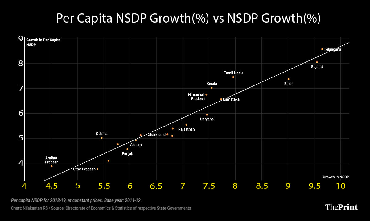 Uttar Pradesh, India’s largest state by population, had a NSDP growth of 5.38 per cent while its per capita NSDP grew by 3.79 per cent. That is, the state does not realise all its economic growth in its per capita growth; largely because its population is still growing at a significant clip.