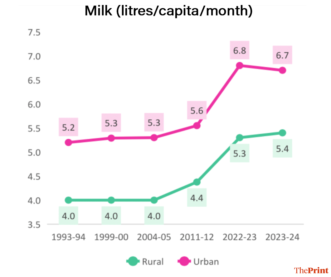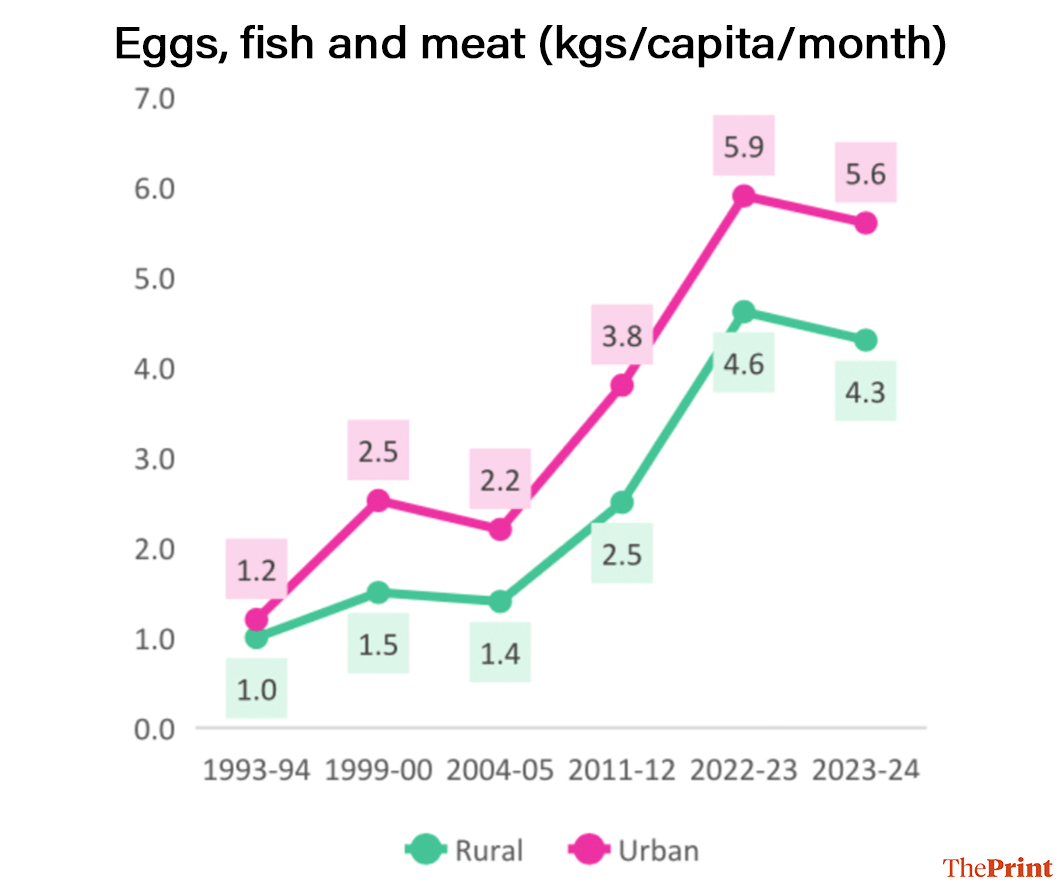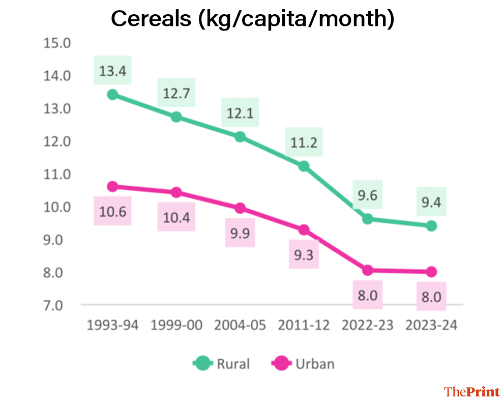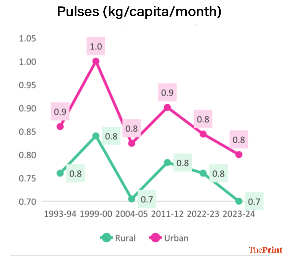 - At the same time, Indian diets have shifted decisively. As per MOSPI’s Household Consumption Expenditure Survey (HCES), the average monthly per capita consumption expenditure (MPCE) on cereals has fallen sharply over the past three decades, while that on fruits, vegetables, milk, and animal-source foods has risen rapidly, especially in urban areas. Indian pulse consumption, however, has declined, reflecting continued issues around its sustained affordability (Figure).