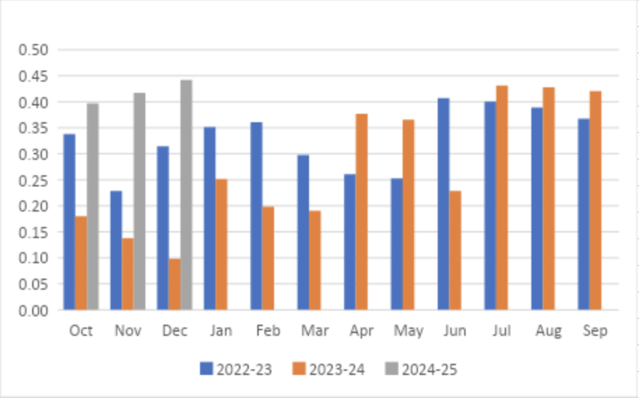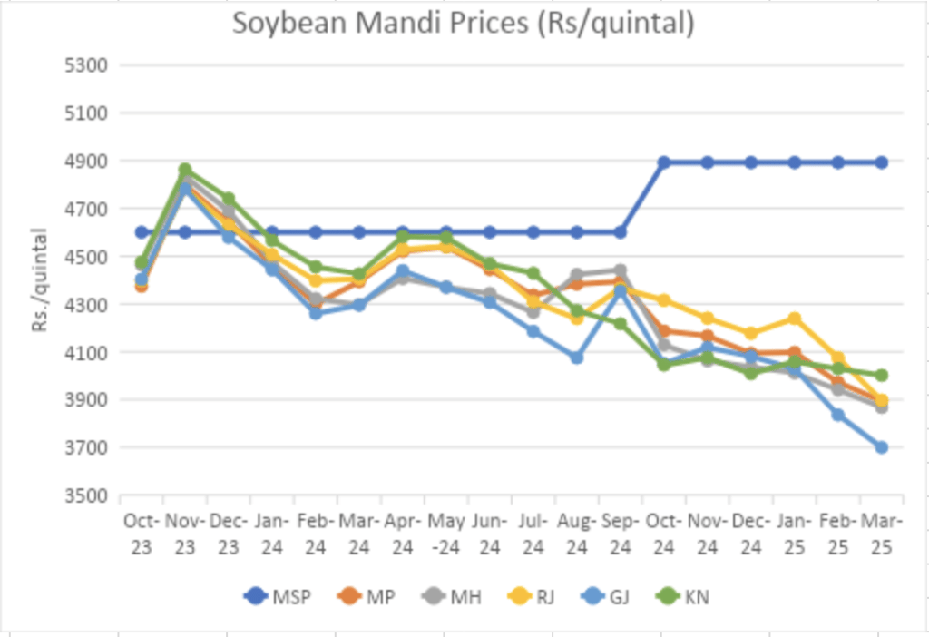 The current MSP for soybean stands at Rs 4,892 per quintal. However, since the start of the harvest in October 2024, mandi prices in key soybean-producing states—Madhya Pradesh, Maharashtra, and Rajasthan, which account for 90 per cent of India’s soybean production—have averaged 17 per cent below the MSP (Figure 1).