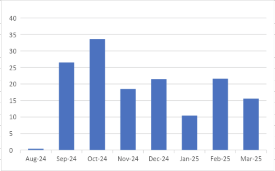 We estimated the monthly cost of producing soybean oil using both domestically sourced soybeans (priced at mandi rates from Agmarknet) and imported crude soybean oil (refined domestically). For domestic crushers, the cost was derived from soybean prices, factoring in milling charges, procurement expenses, and the value of by-products like soybean meal. For imported soybean oil, we adjusted international cost and freight (CNF) prices for import duties, landed costs, and refining expenses. Both costs were calculated at the Indore mandi level, with the price gap illustrated in Figure 3.