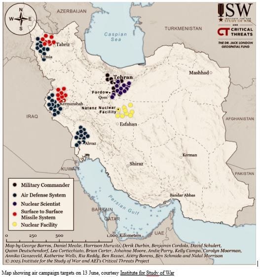 The military aim of the air campaign is to degrade or destroy Iran’s nuclear weapon programme—whether it is uranium enrichment plants, research centres, delivery means, or nuclear scientists/leadership. And in doing so, also target Iran’s response capability for attacking Israel.