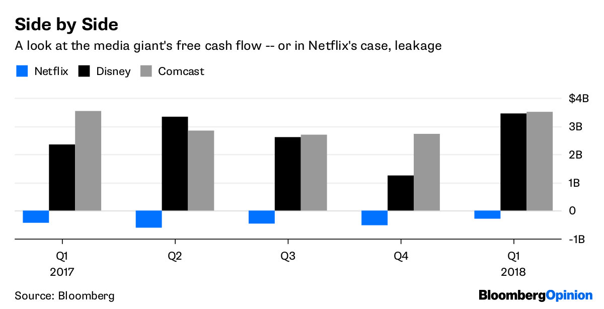 The market has punished companies like Disney and Comcast for pursuing expensive growth opportunities and rewarded Netflix for doing the same. It may someday achieve the financial success its shareholders imagine. For now, though, Netflix brings in a fraction of the revenue Disney and Comcast do, carries more debt relative to Ebitda and burns through nearly $2 billion of cash every 12 months. Disney and Comcast’s operations can generate that much cash in about a month.