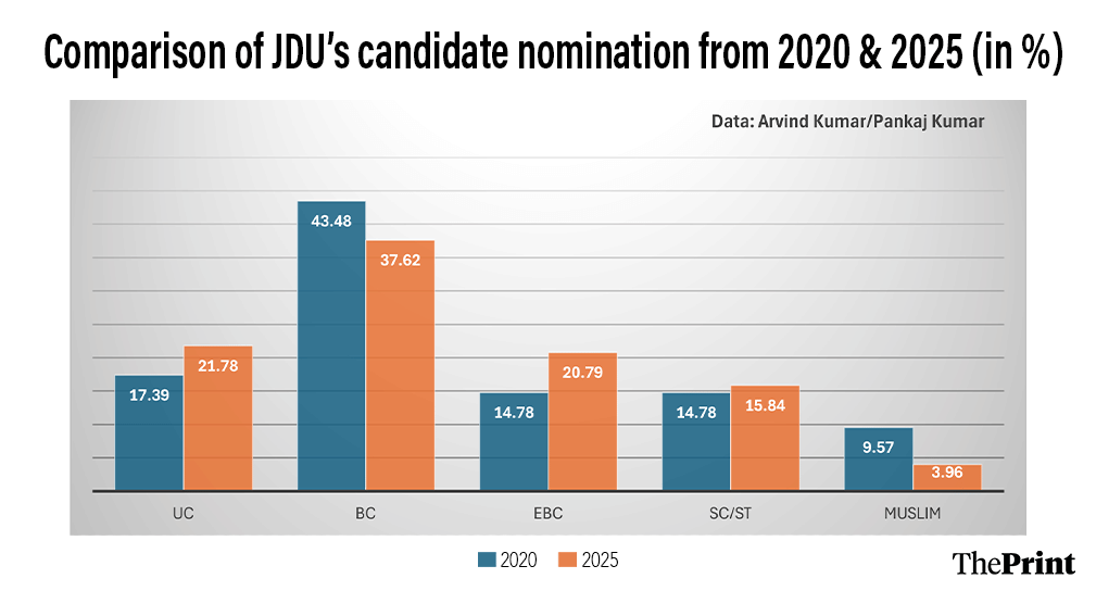 As per the Bihar caste survey, Backward Classes (BCs) constitute 27.13 per cent of the state’s population, while EBCs account for 36 per cent. However, this demographic weight is not proportionally reflected in the JDU’s candidate nominations. Similarly, Muslims make up 17.7 per cent of Bihar’s population, but they represent only four per cent of the party’s nominated candidates.