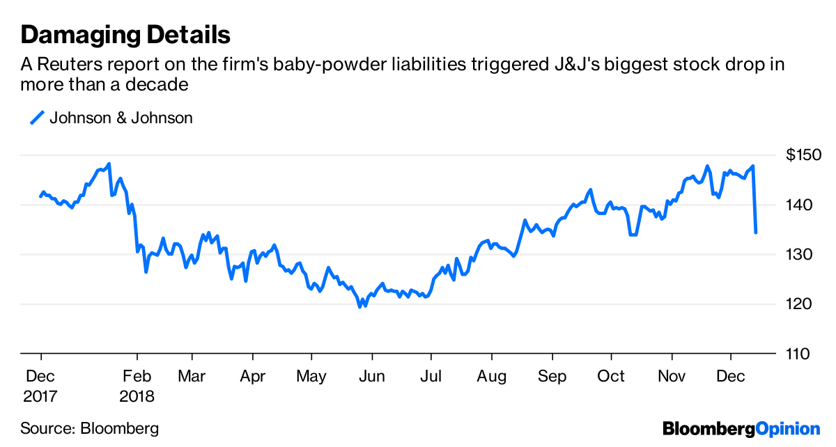 J&J faces major liability risk from lawsuits over a possible link between asbestos in its talc products and cancer. A Reuters investigation released Friday alleged the company was both aware of and worried about the presence of small amounts of asbestos in its baby powder for decades, but didn’t disclose it. The resulting 9 per cent plunge in J&J’s stock was the firm’s largest since 2002, and it erased more than $30 billion from the company’s market value. (J&J subsequently released a statement calling the report “one-sided, false and inflammatory.”)