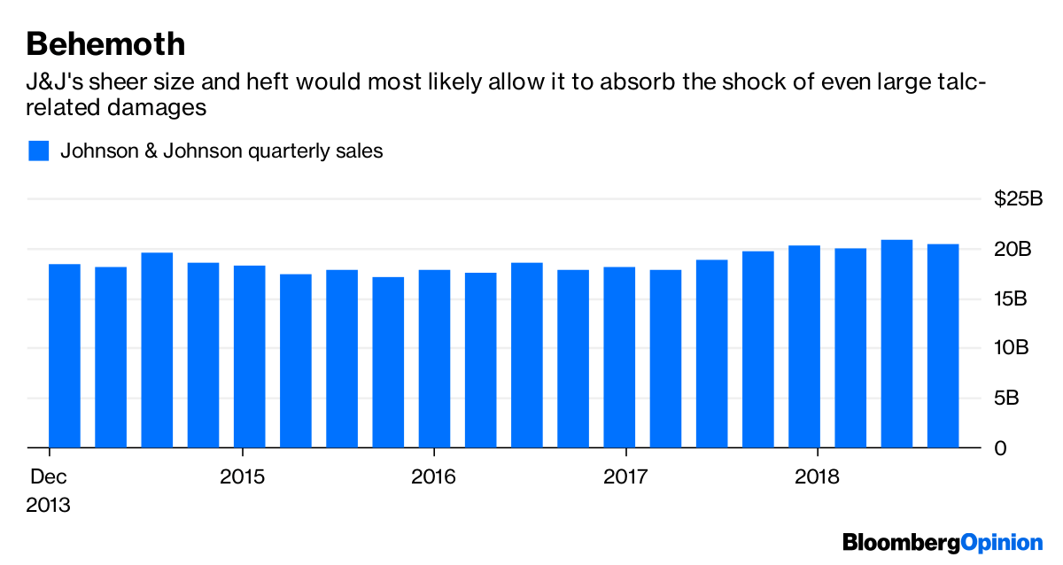 J&J’s historic success in defending itself against talc lawsuits, and the uncertainty of the tie between talc use and cancer suggest that its ultimate damages will be far less than the worst-case scenario. Bloomberg Intelligence puts the more likely total bill at $10 billion to $20 billion. Spread out over multiple years, that’s a drop in the bucket for a company that pumps out the top end of that range in revenue on a quarterly basis.