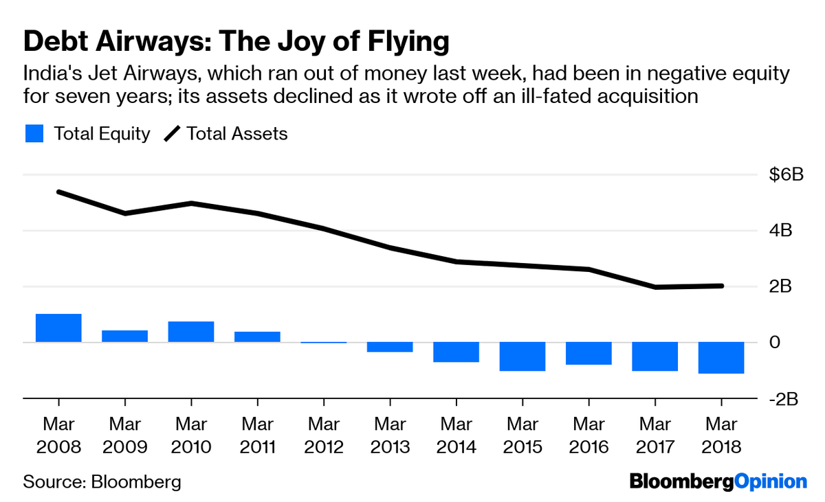 Despite Abu Dhabi’s Etihad Airways PJSC taking a 24 percent stake in the airline in 2013, Jet has been slipping deeper into negative equity for seven years. Had India’s state-run banks insisted on a timely and substantial capital infusion, and had they credibly threatened to dilute Goyal’s 51 percent controlling stake by issuing themselves new shares when the inevitable debt default occurred, Jet would now be flying under a new owner.