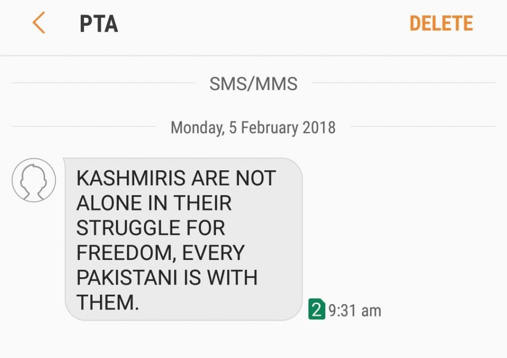 There is a slight chance that you may feel guilty about your well-spent day only to read an SMS from Pakistan’s official telecom provider PTA saying: “KASHMIRIS ARE NOT ALONE IN THEIR STRUGGLE FOR FREEDOM, EVERY PAKISTANI IS WITH THEM”. Only that they’re not.