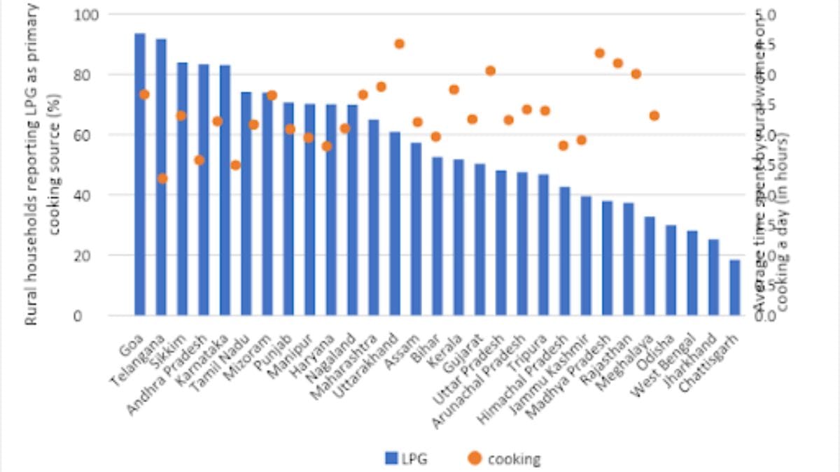 Relationship between share of rural households reporting LPG as primary source for cooking and the time spent by a rural woman a day on cooking.