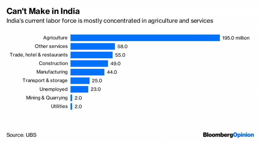 The Indian government’s job-guarantee program, with its skewed incentives, hasn’t helped either. For every worker that signs up for the 100-day plan, fewer will fuel the manufacturing sector and the “Make in India” program. Because wages for those jobs are, in several states, set below the minimum wage, anecdotally workers have been signing up at multiple job sites just to squeak by.