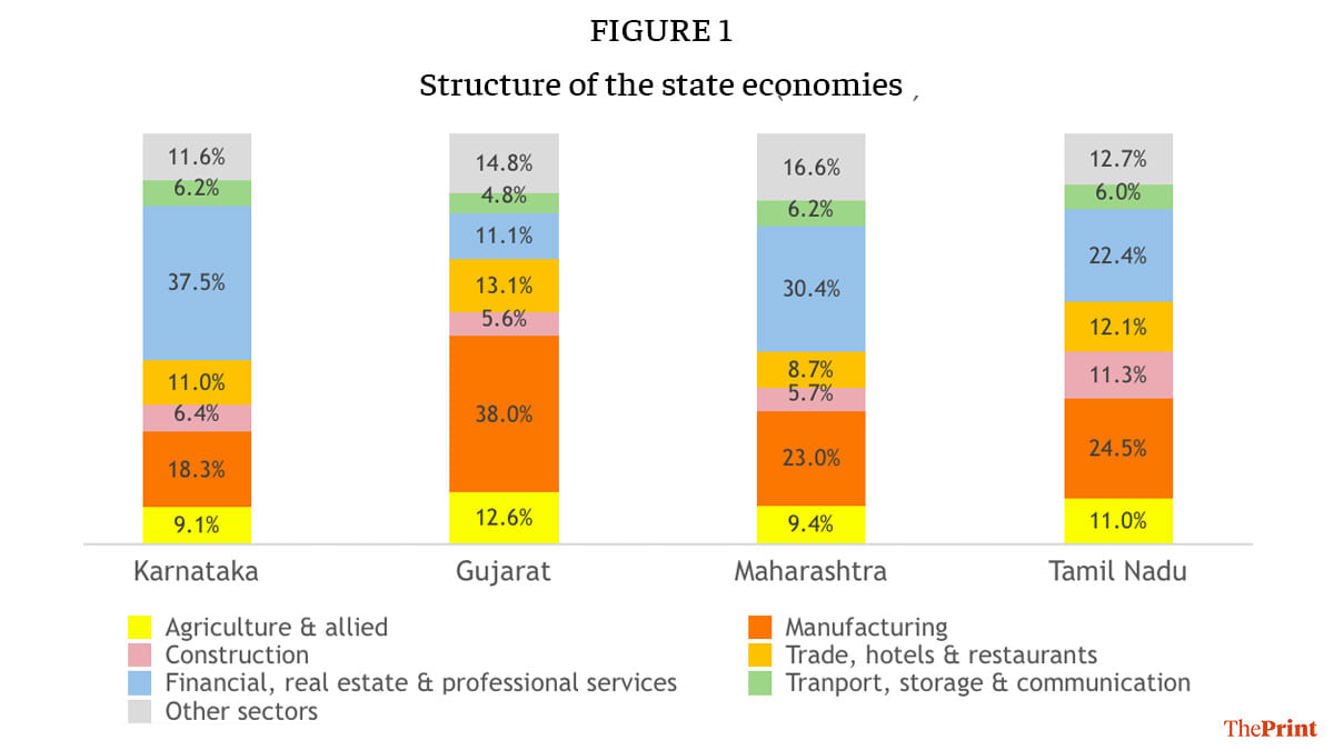In 2018-19, the highest gross value added (GVA) comes from the manufacturing sector in Gujarat (38 per cent of total value added), while the financial, real estate and professional services account for a similar share in Karnataka. In contrast, the share of manufacturing is only about 18 per cent in Karnataka. Tamil Nadu has the most balanced growth model with manufacturing and high-tech services each contributing nearly one-fourth of the GVA. Maharashtra’s growth is tilted towards high-tech services, although not to the same extent as in Karnataka.