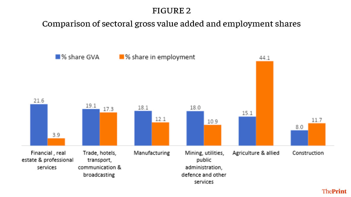 In contrast, a higher share of skilled professional and financial services, given the nature of their tech-intensive production functions, are inherently more productive, thereby requiring a much smaller proportion of employment. While the largest gross value added is created by these sectors at the national level (nearly 22 per cent), it directly employs the lowest proportion of labour (4 per cent). While the forward and backward linkages of high-skilled sectors do create jobs in other sectors, the indirect job creation tends to be in low-skilled services and construction.