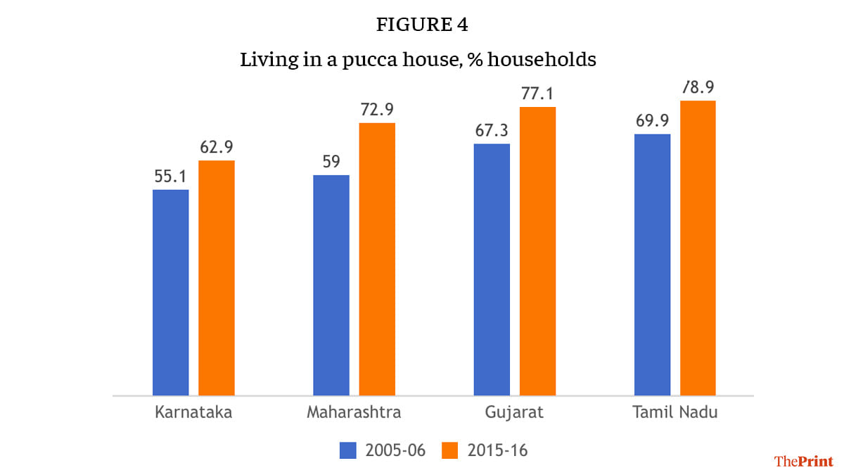 Another indicator that provides insights into the spread of prosperity is the quality of housing, either owned or rented (Figure 4). Once again, in terms of good quality housing, Tamil Nadu and Gujarat lead while Karnataka reports its share of households living in a pucca house in 2015-16 well below the levels seen in Gujarat and Tamil Nadu a decade earlier.
