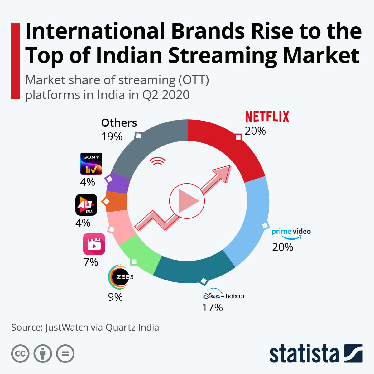 Foreign providers are increasing their footprint in India. In 2020, Amazon announced it would double its Indian investments in Amazon Prime Video, while Netflix said it was spending more than $400 million on Indian content between 2019 and 2020. The approach appears to be paying off: data from June 2020 shows that Netflix and Amazon Prime Video each hold around 20% of market share, while Disney+ Hotstar, owned by the Walt Disney Company, takes 17%.