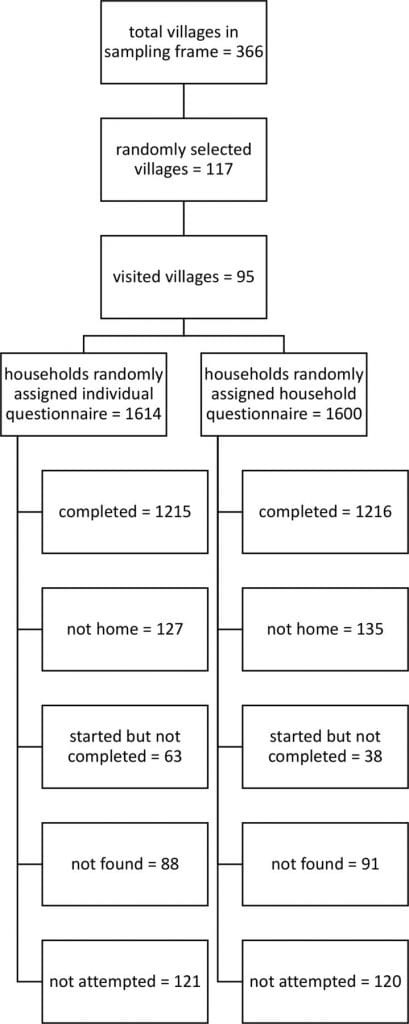 Figure 1 describes the sample selection. The villages visited in each state were randomly selected from the full set of villages included in the 3ie research teams’ studies. The research team led by Oxford Policy Management worked with World Vision in Bihar, the team led by the London School of Hygiene and Tropical Medicine worked with Coastal Salinity Prevention Cell in Gujarat, Eawag worked with Wateraid in Karnataka, and Emory University worked with the Rural Welfare Institute in Odisha. Data for our study were collected in 22–25 villages in each of the four study areas. In most areas, we sampled more villages than we actually visited in order to facilitate coordination with the research teams. Ninety-five villages were visited in total. On average, the survey team interviewed 25 households per village. Data collection took place between March and July 2018.