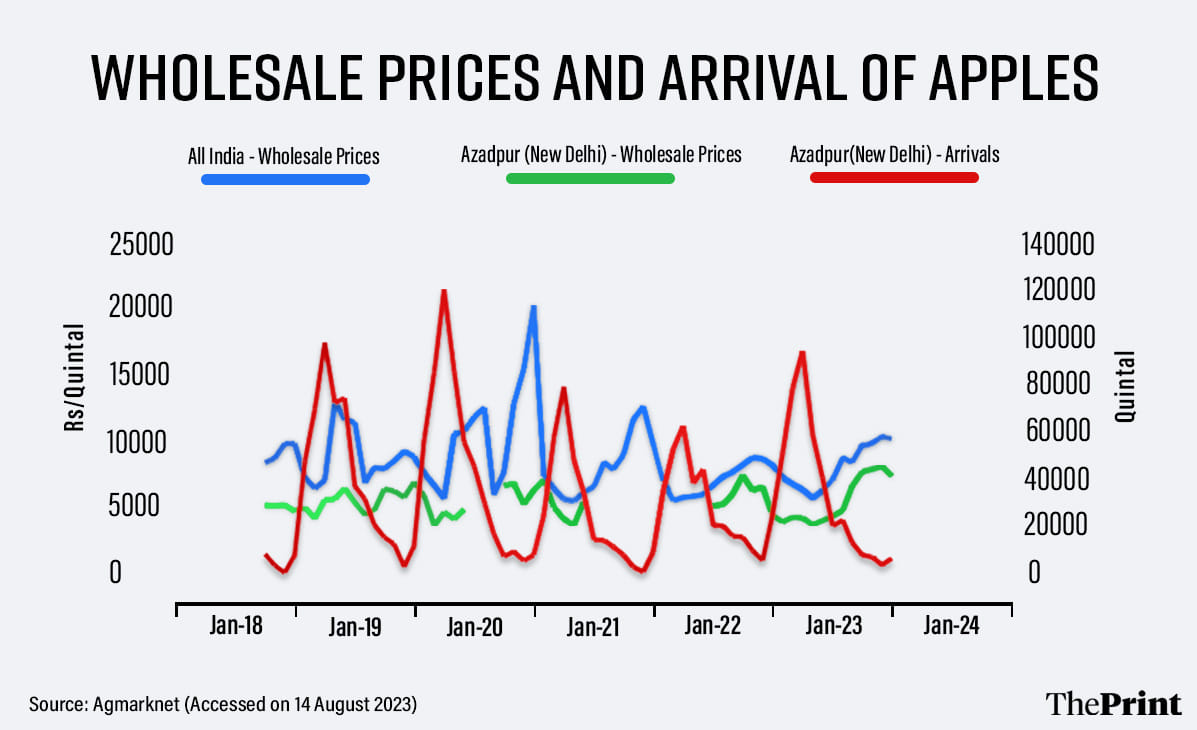 Apples are selling for about Rs 150-175 per kg in Delhi. If the price around peak arrivals is so high, we can expect the prices to spike during the course of this year.