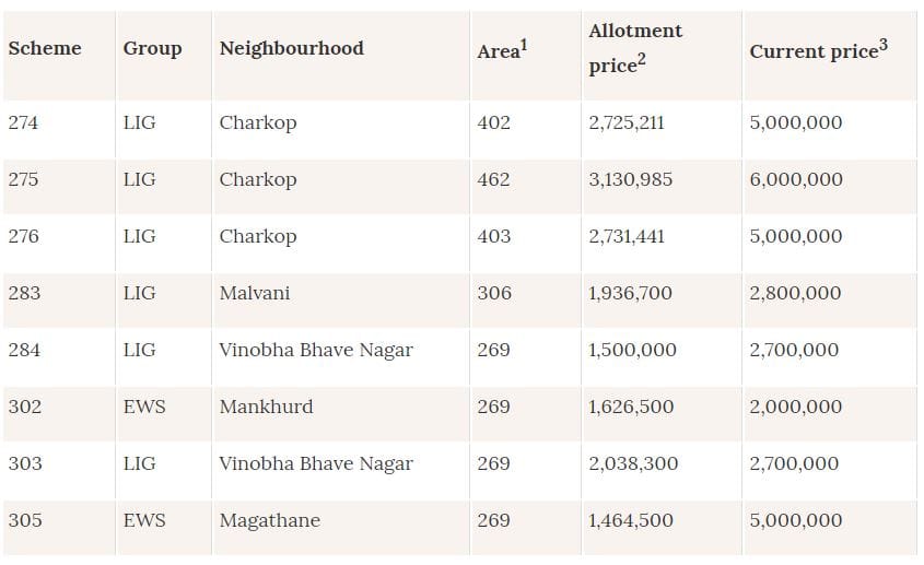 (3) Average sale list price of a MHADA flat of the same square footage in the same community. Data collected from magicbricks.com