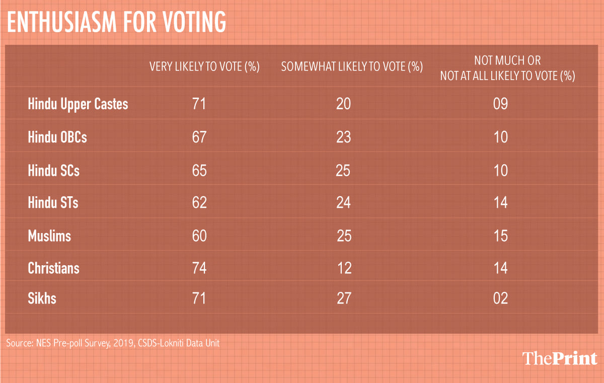 Out of them, 85 per cent Muslims respondents said that they were likely to vote in the 2019 Lok Sabha elections. This overwhelming enthusiasm for voting confirms that the prevailinganti-Muslim environment does not affect Muslim participation in political processes. It simply means that Muslims, like other marginalised communities – particularly the SCs and STs – still believe in the efficacy of their votes.
