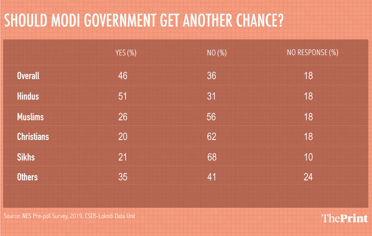 Although the BJP has always been seen as a pro-Hindu party, it has nurtured a clear anti-Muslim image under the leadership of Narendra Modi and Amit Shah. The Modi government’s reluctance to control violent Hindutva politics is a signifier of Hindu majoritarianism. Most of the Muslim respondents, like other religious minorities, do not think that the Modi government should be given another opportunity.