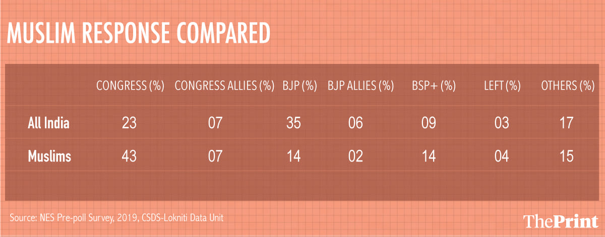 CSDS-Lokniti’s pre-poll survey 2019 is a useful source to explore these questions. The survey was conducted in the last week of March 2019 among 10,010 respondents spread across 19states of India. Thirteen per cent of the respondents were Muslims.