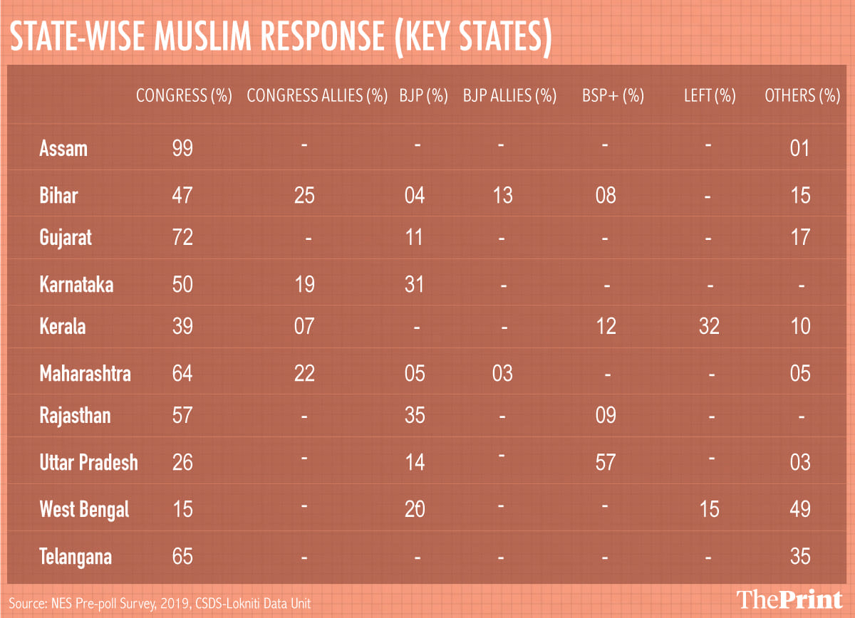 A majority of Muslims in Assam, Gujarat and Telangana clearly expressed their preference for the Congress. This trend exists in Bihar and Maharashtra as well, where the Congress is in alliance with other parties.