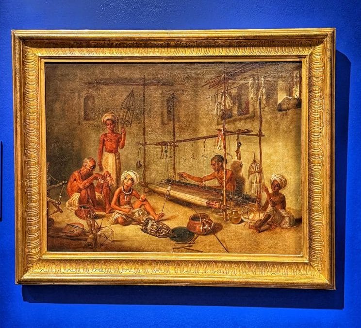 Devis spent around a decade in India, securing a number of significant portrait commissions. In 1792, he found particularly rich subject matter in Santipur, a major centre of the Bengal muslin industry. The Weaver, one of twenty-six paintings made during this period, depicts the interior of a weaver’s home in Santipur.
