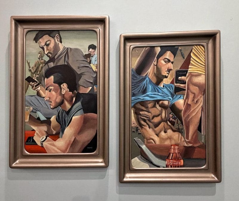Part of the series Lie Machine: Men and the Moon Do Not Care, the paintings depict men absorbed in moments of everyday leisure—watching reels, connecting through screens over cups of tea, coffee, and cigarettes. Above them, the skies are populated not only by the moon, but by missiles and drones, signalling an uneasy convergence of the everyday, and the militarised.