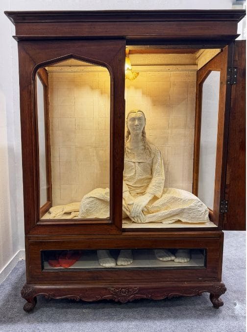 The haunting sculpture is made from traditional Korean Hanji paper and housed in old wooden furniture from Kolkata. Chowdhury’s work enact human relationships. Though she works usually in oils on canvas, she has experimented in different media.